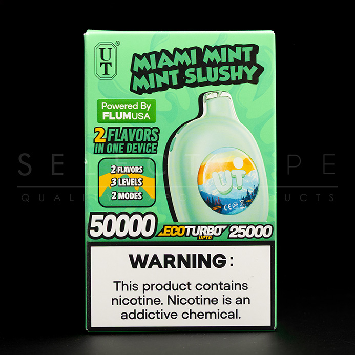 Select Vape presents the Flum UT 50k Disposable Vape by (Flum). Unlock the future of vaping with the Flum UT 50000 Disposable—a smart, high-capacity device built for serious flavor enthusiasts. This innovative disposable features a dual-flavor toggle and two power modes: Eco Mode for up to 50,000 puffs or Turbo Mode for dense clouds and bold flavor at 25,000 puffs. A digital display keeps you informed with real-time battery and e-liquid levels, while the dual-tank design lets you seamlessly switch between two distinct flavor profiles.